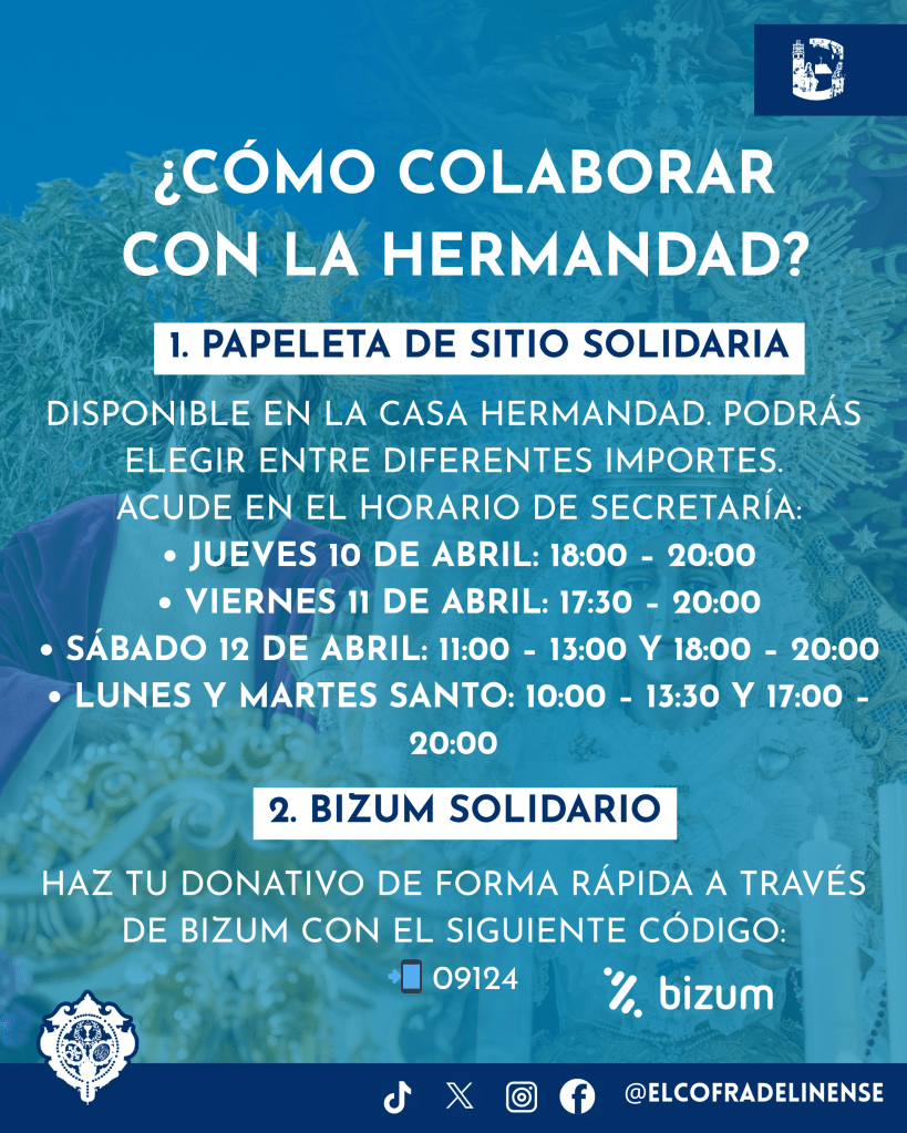 Ante esta lamentable situación, la Hermandad ha hecho un llamamiento a la solidaridad de sus hermanos, devotos y fieles en general, habilitando una “papeleta de sitio solidaria” que podrá adquirirse en la Casa Hermandad durante el horario de Secretaría. Asimismo, se ha puesto a disposición de quienes deseen colaborar un Bizum con el código 09124 para facilitar las donaciones.