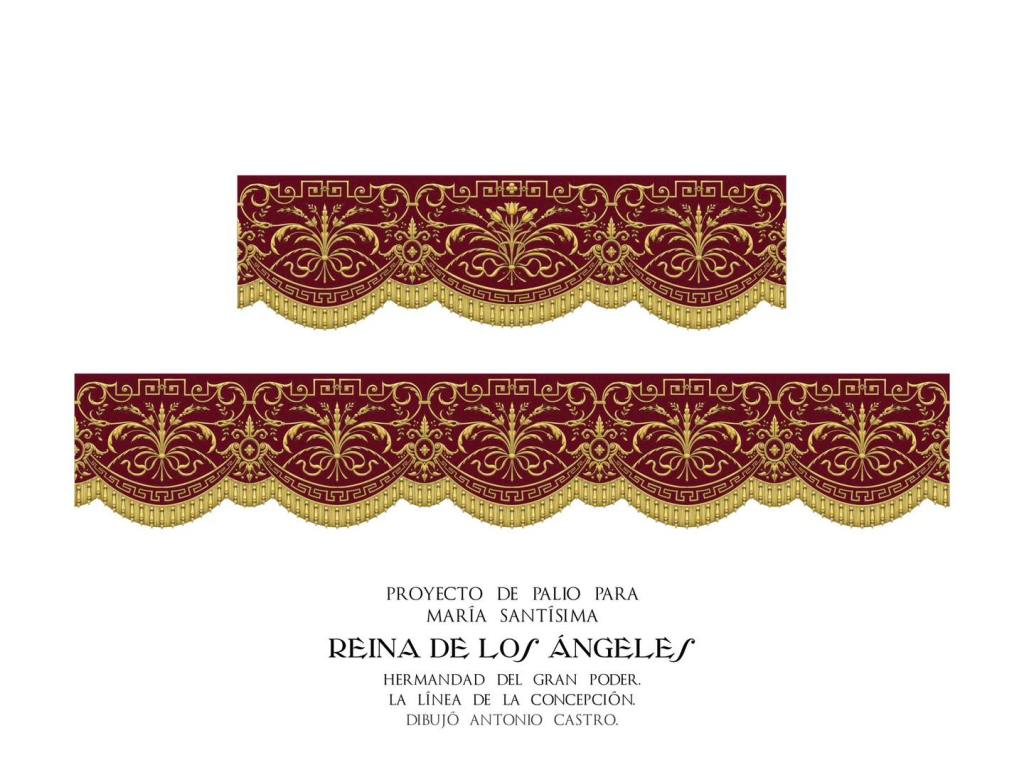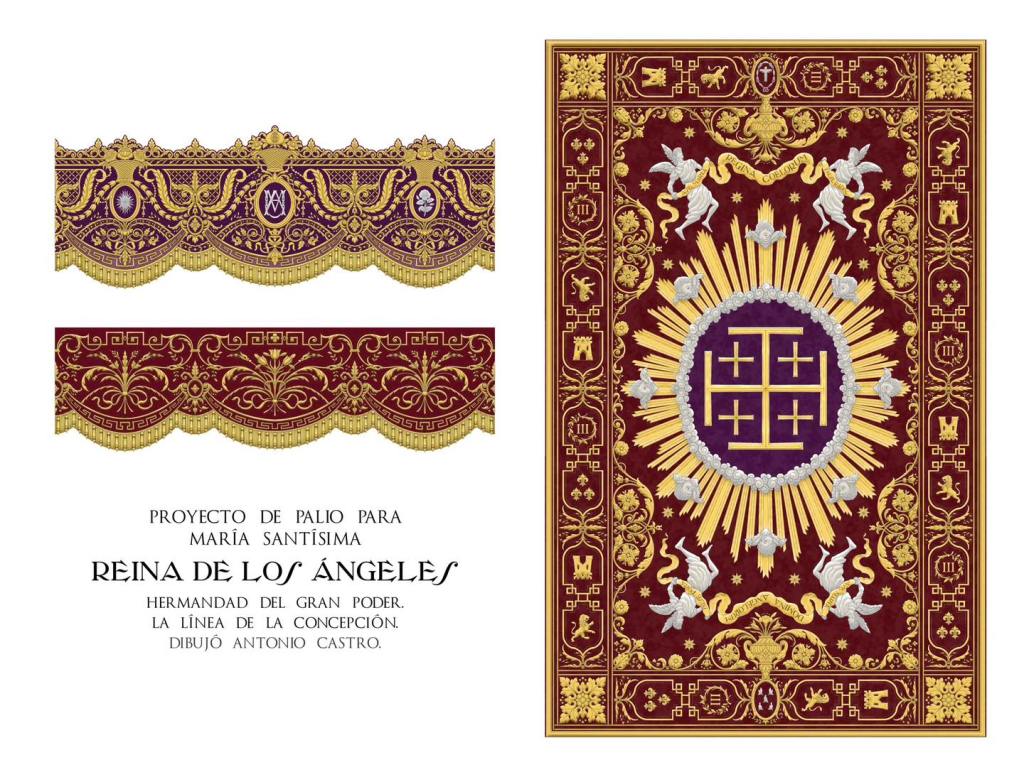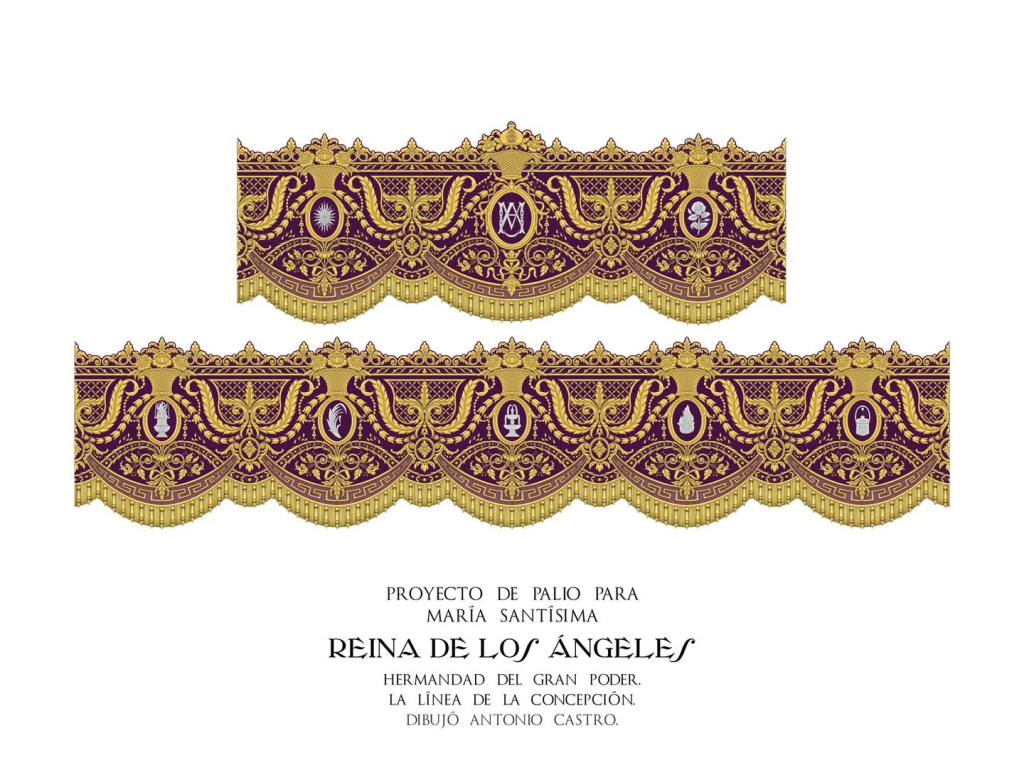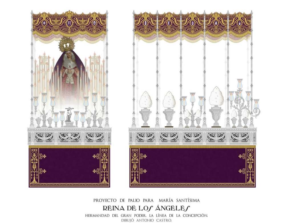 Entre los detalles más destacados, las bambalinas exteriores serán de terciopelo púrpura, mientras que las interiores y el techo del palio se confeccionarán en terciopelo granate, favoreciendo una mayor luminosidad gracias a la mejor reflexión de la luz. El diseño de las bambalinas, de corte original y solemne, incluye un fleco con bellotas que aporta un carácter único. Además, cada paño exterior estará adornado con atributos mariológicos en plata, inspirados en la iconografía presente en la capilla del Noviciado de San Luis de los Franceses en Sevilla.