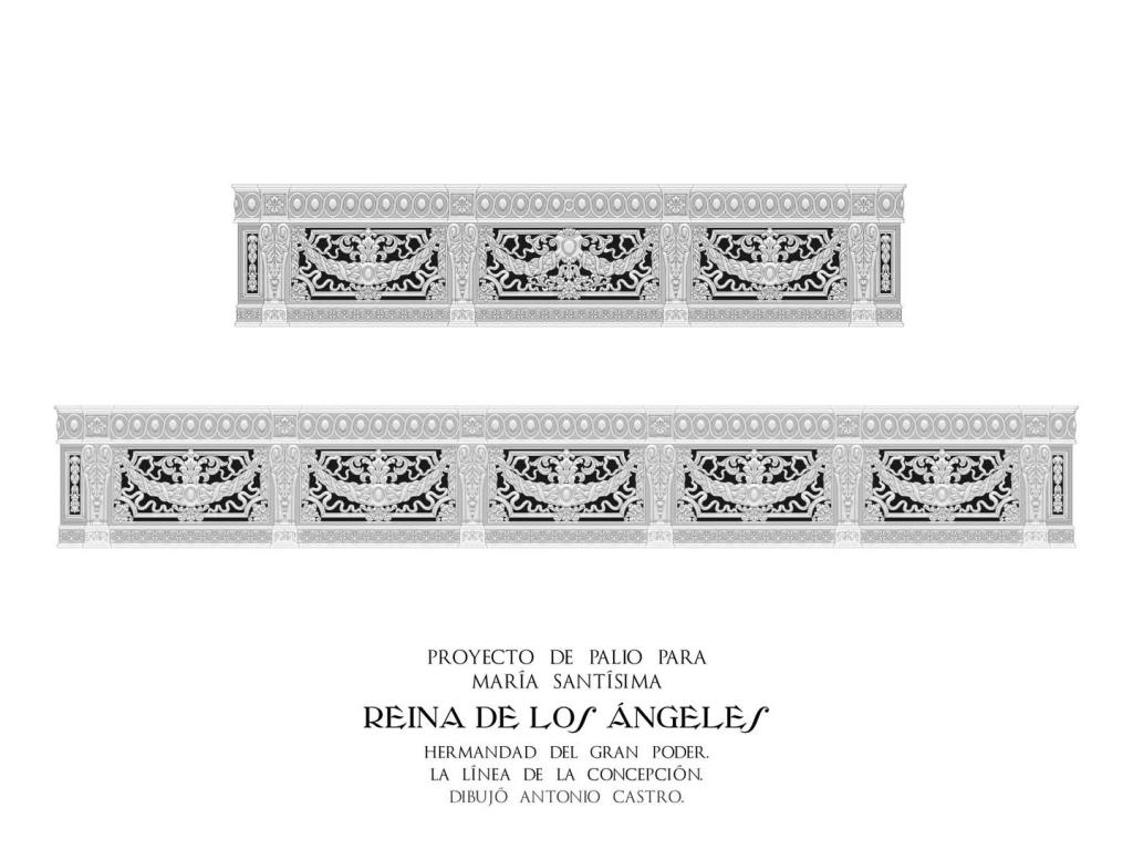 El techo del palio contará con un friso perimetral que incorpora el collar de la Real y Distinguida Orden de Carlos III, en homenaje al monarca que impulsó la proclamación de la Inmaculada Concepción como patrona universal de España. En el centro de la gloria, se situará la Santa Cruz de Jerusalén —tercera titular de la cofradía— rodeada por querubines, nubes y resplandores. También destacan los ángeles que portan guirnaldas con inscripciones en latín extraídas de la antífona “Ave Regina Cælorum”.